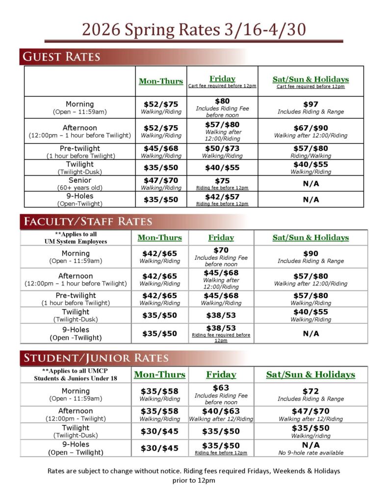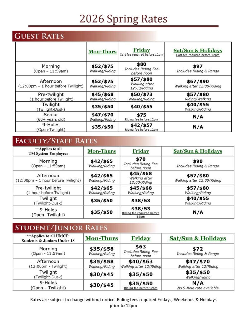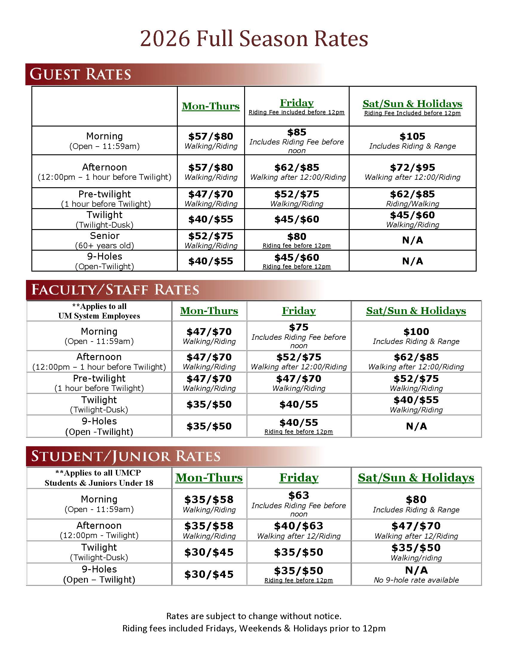 • Cart Fee is required Friday – Sunday and Weekday Holidays prior to 12 PM (During Golf Season 3/15-11/30)